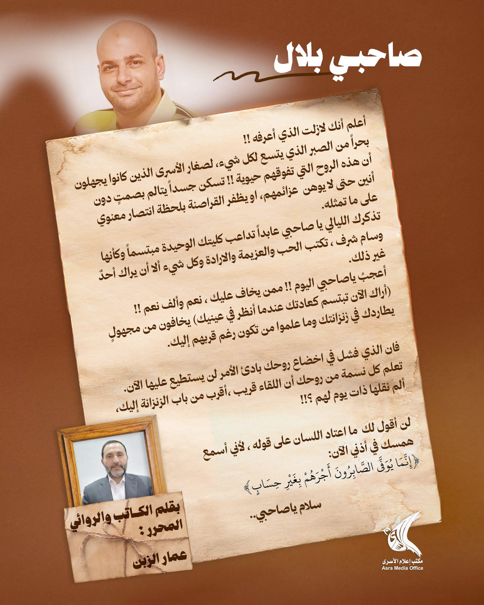 *رسالة وفاء من المحرر عمار الزبن إلى صديقه الأسير بلال البرغوثي داخل سجون الاحتلال